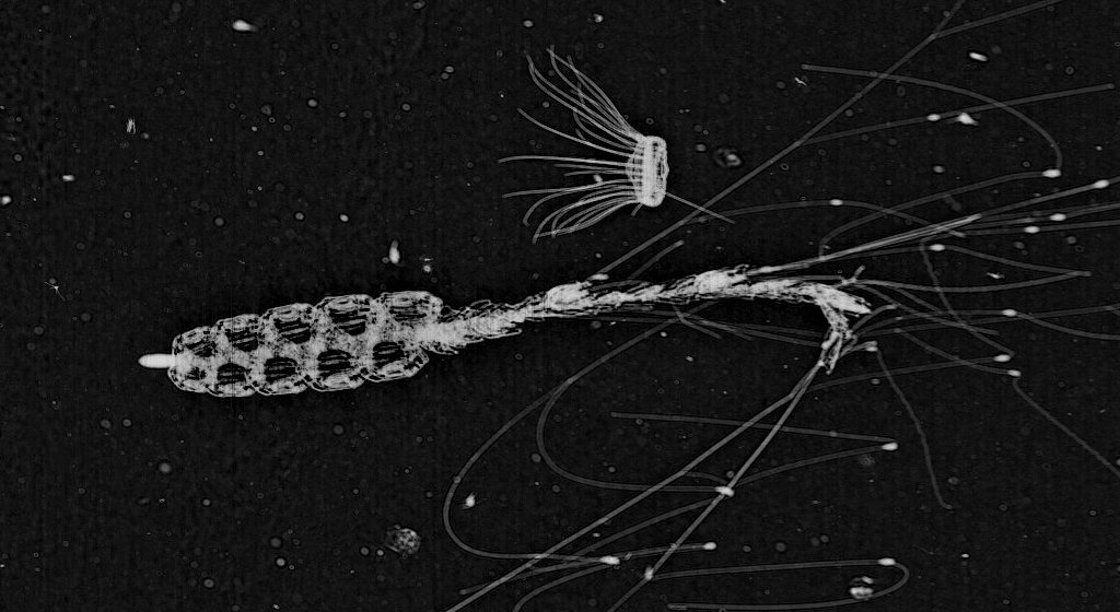This awesome picture from Plankton Portal shows a siphonophore (referred to by some users on the project as a corncob) and a solmaris jellyfish. Siphonophores may look like one creature but they are actually a combined colony of multiple smaller animals. The most well known member of the family is the Portuguese Man o’ War, which has a venomous sting that can cause severe pain to humans.