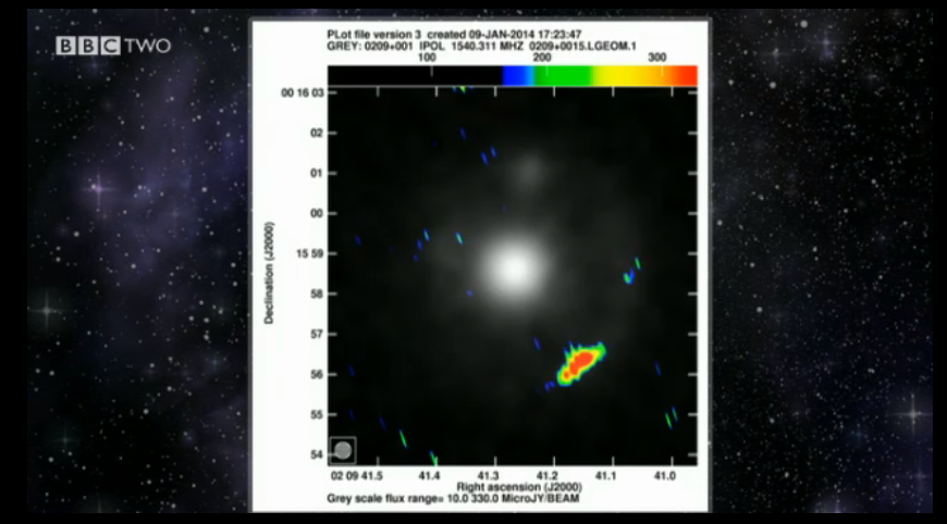 The image above was taken using the eMERLIN array of radio telescopes, which included the Lovell Telescope at Jodrell Bank Observatory where BBC Stargazing Live is filmed. It shows the arc of a lensed galaxy which is over 10 billion lightyears from Earth! This lens event was discovered by our volunteers on Space Warps during this year’s series of Stargazing Live shows. Below is the original VICS82 image seen by our citizen scientists.