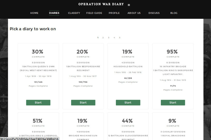 Operation War Diary launch only 11 days ago and already over 135,000 pages have been classified by thousands of volunteers (or citizen historians)! The majority of the original batch of one hundred diaries we put on the website have been completed already and more have been introduced. Get involved in this amazing project and become a citizen historian now at http://www.operationwardiary.org/