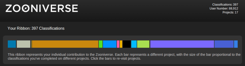 As part of the celebrations for the Zooniverse reaching one million registered volunteers, we’ve updated your ‘current projects’ page to show you some more stats. The main addition is your ‘ribbon’. This is a colourful representation of how many classifications you’ve done across different projects. You can see mine above (I like Snapshot Serengeti a lot). You can also see your ‘user number’, which shows how many people had joined the Zooniverse before you. As you can see I was number 88,912 to sign up. I actually classified thousands of galaxies on the original Galaxy Zoo back in the day, but they don’t show up on this page 😛