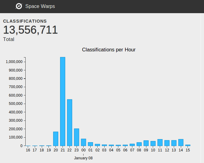 To continue the graph theme for this week I have got for you the most impressive classification rate we have ever seen at the Zooniverse, and most likely the highest rate in the history of citizen science! It peaked at over one million classifications in an hour on the Space Warps project during the evening of January 7th, when the project was featured as part of BBC’s Stargazing Live television show. Most of our projects take days, weeks or even months to achieve that number of classifications! That’s the Cox Effect for you 😉