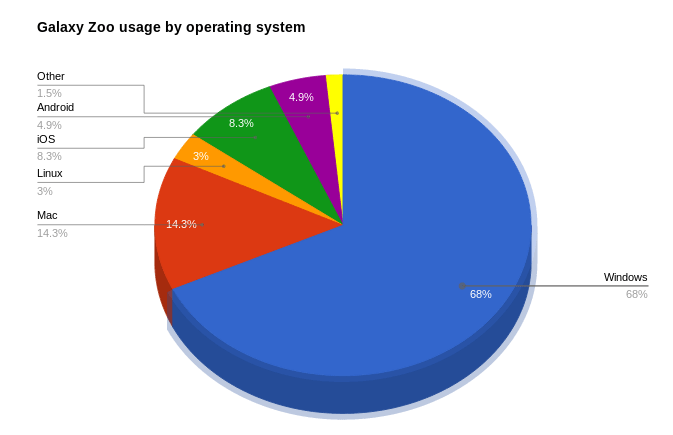 Which operating system do you use to take part in your favourite Zooniverse project? Here we have plotted the data for which operating system is preferred by volunteers on Galaxy Zoo. We see that the majority of them are using Windows (which is true for all of our projects), however almost 15% are classifying galaxies on their mobile or tablet. Perhaps a Galaxy Zoo app would be popular? Watch this space…