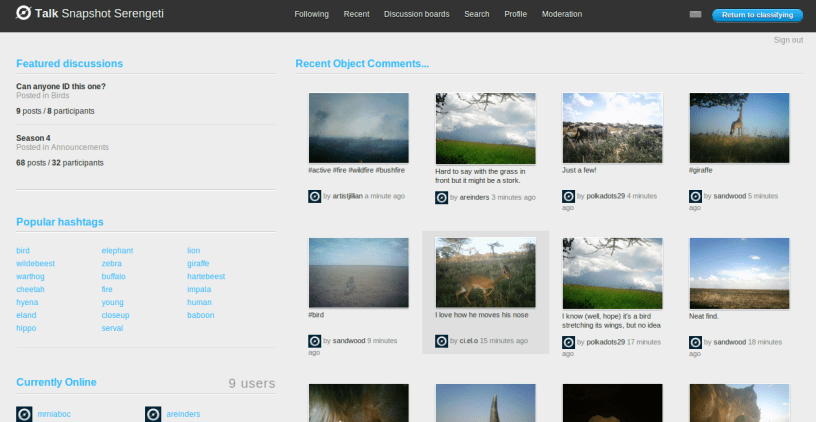 Have you used the ‘Talk’ area of your favourite Zooniverse project? Talk is a discussion area where you can comment on the images you have been classifying and interact with other volunteers who are taking part in the same project as you. Pretty cool huh? The majority of our projects have a Talk area, and we find that more than 10% of our volunteers make comments there. You can also use it to do a lot more, like keep collections of your favourite images and search for different tags. For example, you can see all images on Snapshot Serengeti that have been tagged with the word ‘beautiful‘.