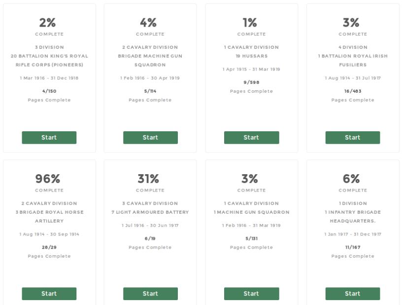 Did you know that on Operation War Diary you can view all of the diaries currently live in the project and see how much of each one has been completed? Get your teeth into a fresh diary, or jump in at the end and help get one across the finish line, it’s up to you!