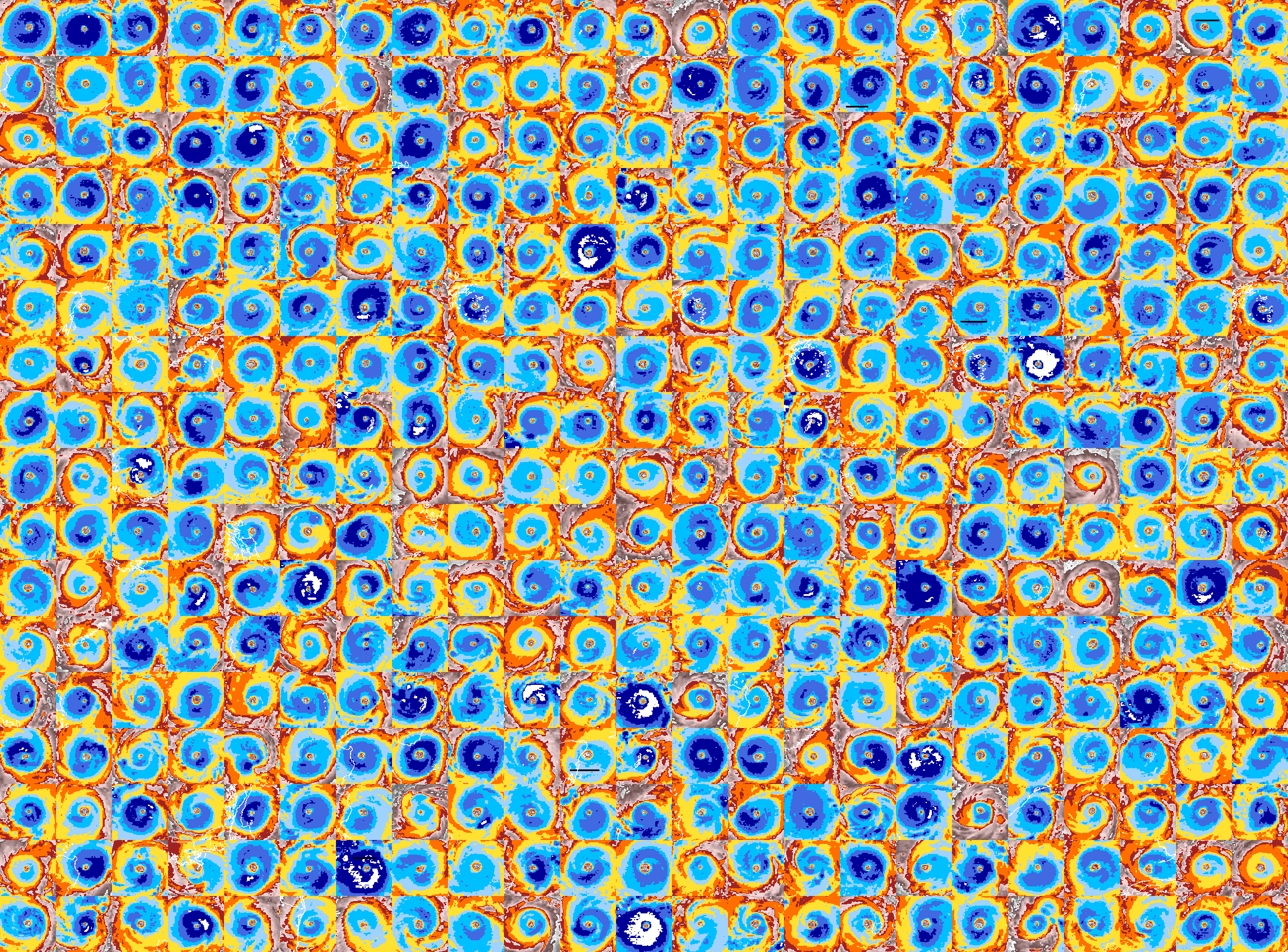 This is a grid of images of the storms from Cyclone Center that was produced by one of the scientists on the project. I find it strangely beautiful. Click the image for a poster-sized version that you can print out and use to cheer up your office (or bedroom, or fridge, or print out enough to completely wallpaper your entire house with it), as I have done, and try out the project now at www.cyclonecenter.org