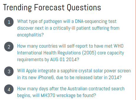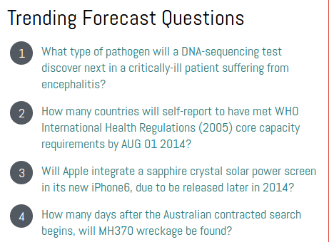Here is something a bit different from the word of crowdsourcing. SciCast is a platform for forecasting the future of science and technology. Above you can see some of the trending questions which the crowd is being asked to forecast. To find out more, check out their site at https://scicast.org