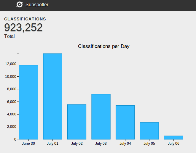 Since the full launch of the Sunspotter project just over three weeks ago almost one million classifications have been done by thousands of our amazing volunteers! Join them today at www.sunspotter.org