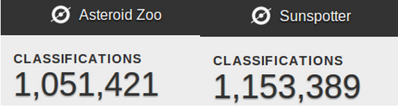 Thanks to the outstanding efforts of our hard-working volunteers two of our newest projects, Sunspotter and Asteroid Zoo, have already passed the one million classifications mark! A huge thanks to everyone who has taken part in the projects so far. If you haven’t, then get on it now at www.sunspotter.org and www.asteroidzoo.org