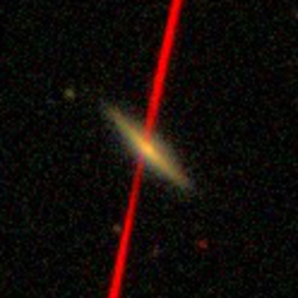 This image caused a little bit on confusion on Talk from volunteers who weren’t sure what was causing the red beams that appear to be emanating from the centre of this galaxy. It is in fact a perfectly placed trail caused by a man-made satellite in orbit around the earth. There are thousands of satellites in orbit around the earth. If you look up on a clear night you won’t have to wait long to see one. They look like faint stars moving steadily across the sky. Every so often they cross right in front of where a telescope is looking while we’re taking an observation. This is what happened here. In Galaxy Zoo images they tend to be either red, green or blue streaks. This is because the galaxy images are actually made by combining pictures in these three colours and, as the satellite is moving fast, it is only captured in one of the images.