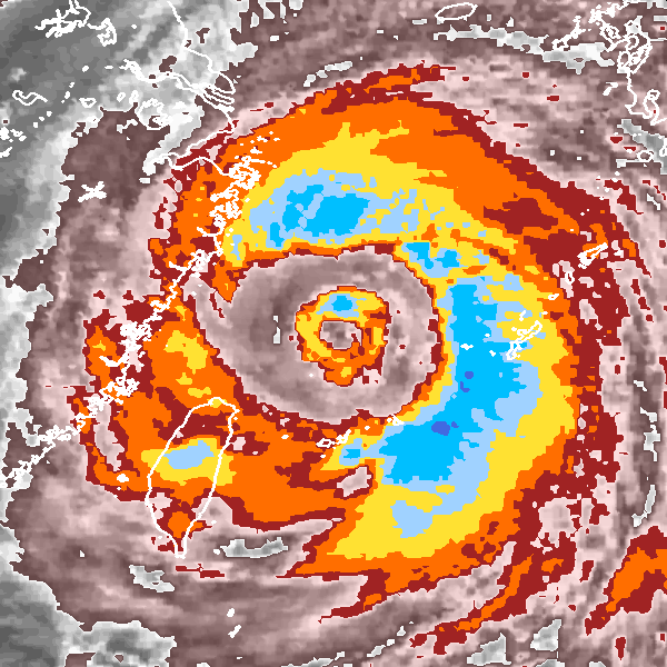 In this fascinating satellite radar image found through the Cyclone Center project, Typhoon Winnie (1997) displays an interesting feature of some strong tropical cyclones: a double ring of winds around the eye, called concentric eyewalls. Typically, as a storm like this continues, the inner eyewall will eventually dissipate as it is robbed of energy by the outer eyewall, called the “eyewall replacement cycle.”