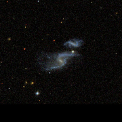 The beautiful bright blue colours of these two merging galaxies shows that there is a lot of star formation going on. See if you can find some signs of star formation while classifying at www.galaxyzoo.org today.