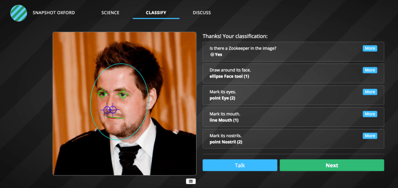 It only took a few minutes for Chris Lintott to create this test project for marking features on faces of Zooniverse employees (yes, that is my face). We will be launching this new platform in the coming weeks. Stay tuned!