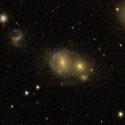 There are actually four amazing galaxies in this week’s image from Galaxy Zoo. The three in the centre look like they could be merging, and there is some star-formation going on, as can be seen from the bright-blue regions.