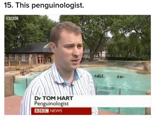 Yeah, that’s right, it’s a real job title! At least according to the lead scientist behind Penguin Watch, and the BBC. See the project’s very own Tom Hart on this BuzzFeed list of The 16 Funniest BBC News Captions Of All Time.