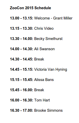 If you have any comments or questions for the speakers, please tweet them with the hashtag #ZooCon2015 and we will try and answer them. We really look forward to you joining us remotely for what should be a fantastic afternoon.