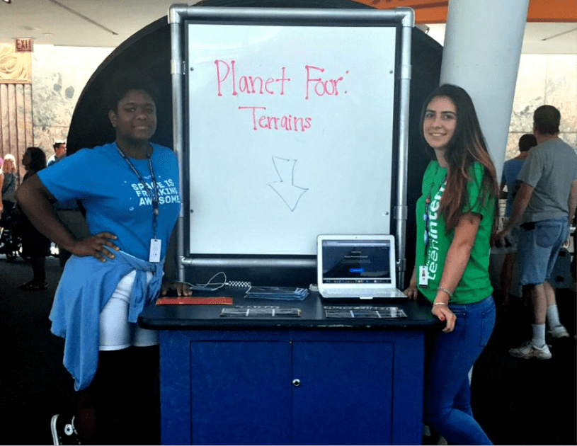 As many of you may know, around half of the Zooniverse staff work at the Adler Planetarium in Chicago. As part of our internship, Sara and I have created a cart that displays images and an activity from Planet Four: Terrains. Throughout the week, Sara and I have been facilitating the cart on the floor of the museum and have been informing guests about citizen science and Zooniverse. We continue to enjoy watching people discover citizen science and getting the word out about Zooniverse. If you live in the Chicago area, please come and visit us!