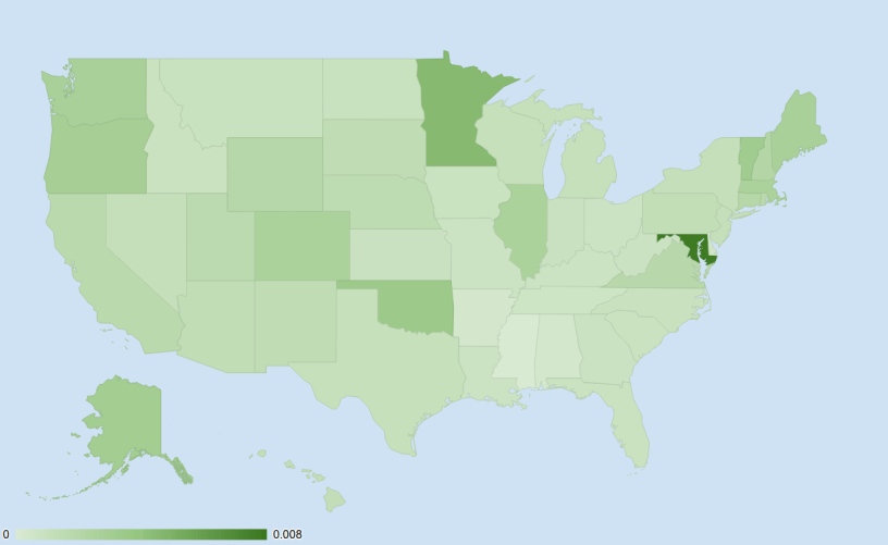 This plot shows visits to zooniverse.org in the last year by US State as a fraction of the state’s population. Marlyland really loves us! As does Minnesota. That may be something to do with our fantastic team based there at UMN. How did your state do?