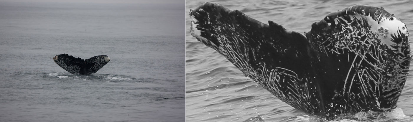 But life hasn’t always been fat and happy for 11799. This tail tells the story of a near-death experience for the whale. 11799’s tail is severely scarred and deformed from an attack by orcas, the world’s largest mammal-eating predators. The attack probably happened while 11799 was quite young; a high percentage of humpback whales show orca attack scars in their first two years. But this attack was particularly severe, where the attackers bit off both tips of the young whale’s tail. Even as large as Orcas are — up to 9 meters and 6 tonnes — the young humpback was probably as big as any of its attackers. So to kill a whale, the orcas have to hold the animal down and drown it. Fortunately for 11799, it got away and has lived to ‘tell the tale’ 🙂
