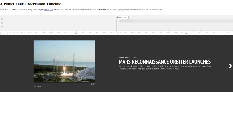 Ten years ago today, the Mars Reconnaissance Orbiter reached Mars and went into orbit around the Red Planet. The MRO carries aboard the cameras that beam back the images used on Planet Four and Planet Four: Terrains. To celebrate its ten year anniversary, project scientist Meg Schwamb has made an excellent interactive timeline showing the major highlights in the MRO mission and the Planet Four project. Check it out at mschwamb.github.io