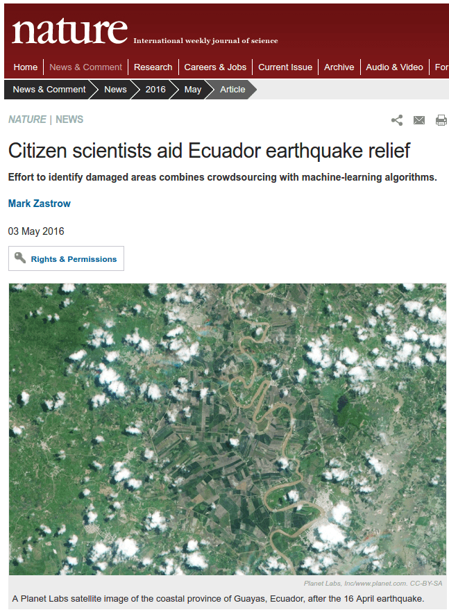 Check out this great Nature article about our Ecuador earthquake response project. It highlights the amazing work done by thousands of Zooniverse volunteers on The Planetary Response Network and how it is being used to help people affected by the tragedy. Read the full article here www.nature.com/news/citizen-scientists-aid-ecuador-earthquake-relief-1.19861