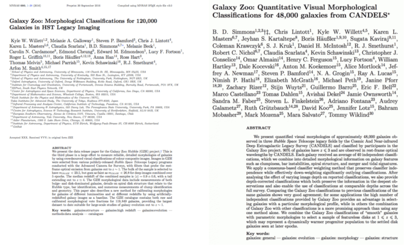 The papers are presenting results from Galaxy Zoo: Hubble and Galaxy Zoo classifications of images from the CANDELS survey. You can read more about them at blog.galaxyzoo.org. To correspond with the publications, the data from both studies has been made freely available at data.galaxyzoo.org for anyone to explore.