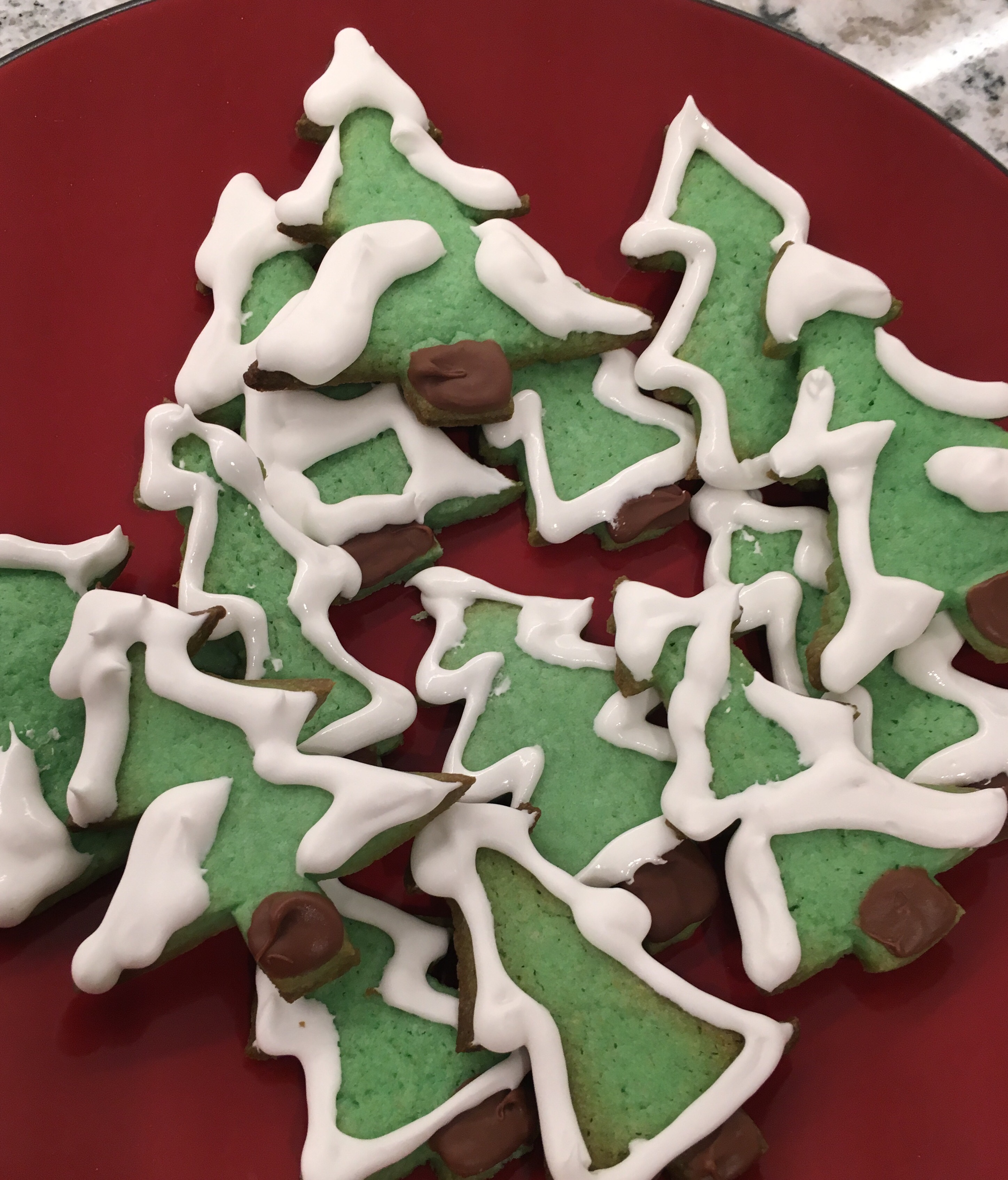 To make green cookies, add green food colouring to the liquid ingredients just before you mix with the dry ingredients. Add a few drops at a time until you get the colour you want, keeping in mind that the shade will lighten slightly when you add the dry ingredients. The colour here required 15 drops of green. Decorate the trunk by placing a single chocolate chip on each cookie trunk immediately after they come out of the oven, then spreading the chocolate across the trunk once the chocolate melts. The icing is different from past years, and it uses the 2 egg whites left over from the cookie recipe. Combine the whites with 2 3/4 cups of icing sugar, and whip (with an electric mixer, unless you enjoy forearm pain) until the icing can hold soft, glossy peaks. The icing is bright white, so it’s perfect for snow-covered branches.