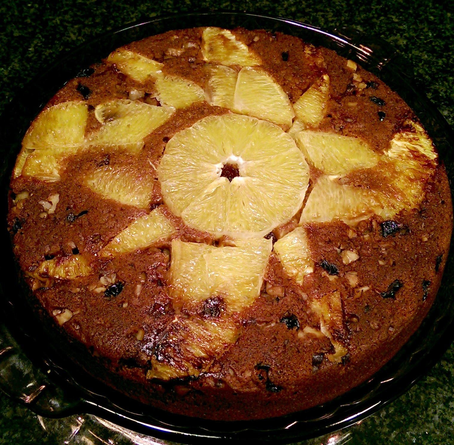 Directions: Pre-heat oven to 350 F / 175 C. Grease the cake pan well so cake will release easily later. Zest the orange into the wet ingredients bowl, then remove the peel leaving the sections intact to each other. Cut a 1/2 cm cross-section slice from middle of orange (perpendicular to the orange sections). Slice the remaining sections and arrange in a spiral galaxy pattern in the cake pan. Sprinkle raisins and walnuts into pan, they act as additional flavors as well as background objects and dust in your galaxy. Set a side. In the mixing bowl with the orange zest, whisk together the buttermilk (or non-dairy buttermilk option), oil, applesauce, maple syrup and vanilla extract until smooth. In a different mixing bowl combine flour, baking powder, baking soda, cinnamon, all-spice, nutmeg, ginger, and sea salt. Add the liquid ingredients to the dry ingredients. Fold the batter until it’s just combined, ensuring not to over mix it. Pour the batter over your orange galaxy pattern slowly to ensure the slices do not move around in the pan. Bake for 20-25 minutes on the centre rack of your oven. Cake is done when a toothpick comes out clean from the centre of the cake. Transfer pan onto a wire rack and allow to cool completely before flipping. Run a knife alone the sides of the cake to help it release from the pan. To flip, place a large plate over the cake pan and flip while holding firmly onto the pan and plate. Gently lift pan from the plate to reveal your galaxy pattern. If you cake has not released from the pan, return it back against the plate and gently tap the pan and plate together on the counter until the cake releases.