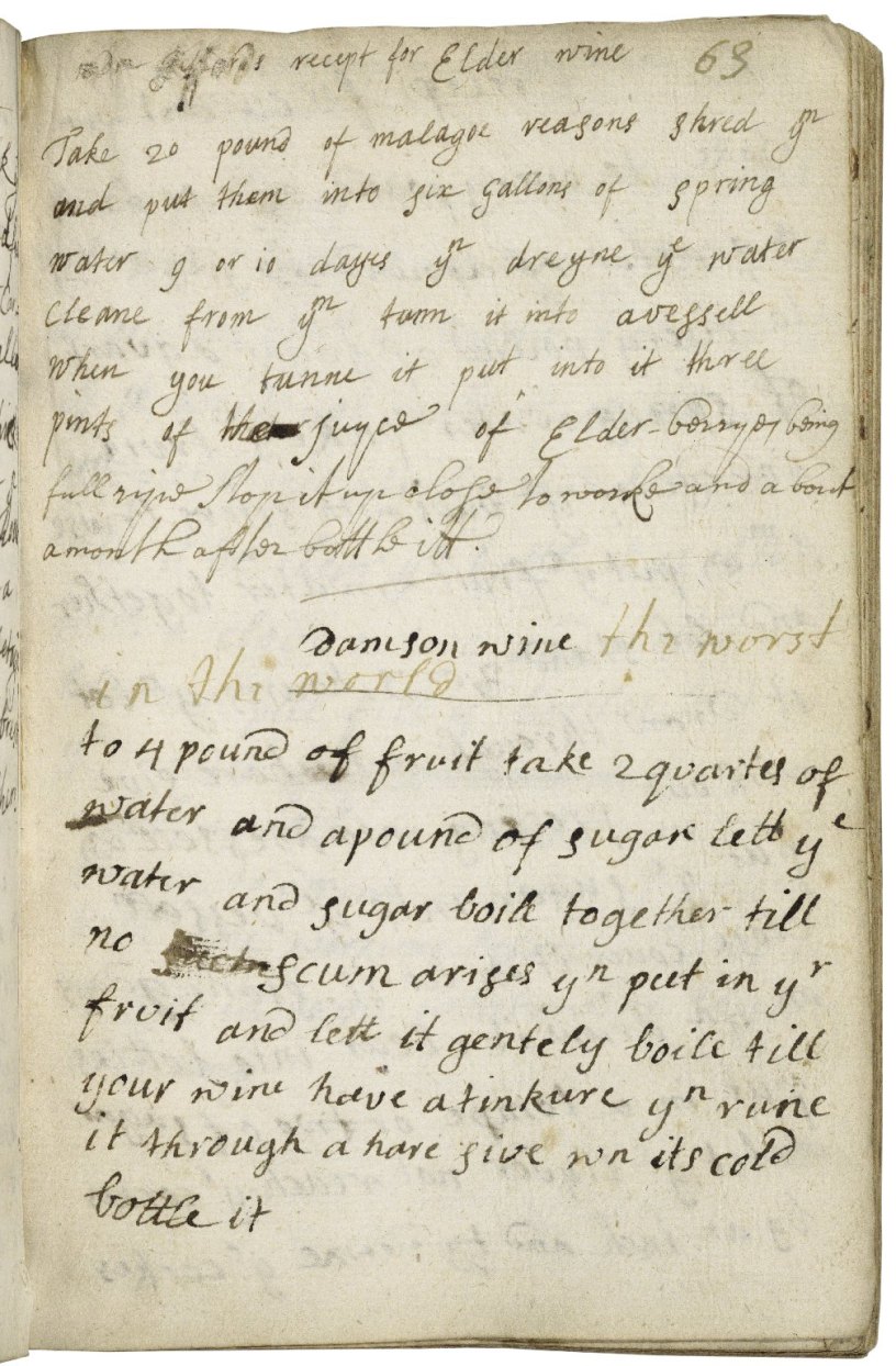 This recipe for Damson wine is from the 17th century recipe collection of Lady Vere Wilkinson, one of many books of recipes and remedies being transcribed by our Shakespeare’s World volunteers. If you think the recipe sounds more like flavoured syrup than wine you’re not alone. Someone saw fit to add a note (presumably having made and tried it) declaring it to be “the worst in the world.” If you’d like to help find a better quality wine recipe, go to www.shakespearesworld.org and start transcribing!
