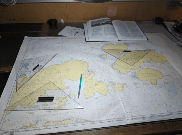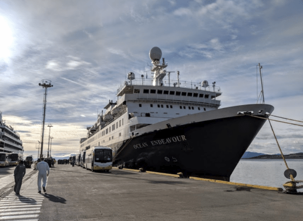 This is the ship that took us on our fantastic voyage – The Ocean Endeavour operated by Quark Expeditions.They still use paper charts for navigation as a back-up to their electronic equipment.Sunset over the Beagle Channel as we head off on our expedition.