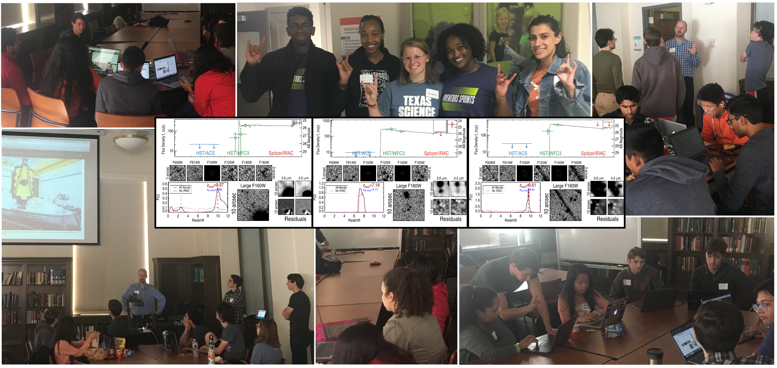 In October, 2019, CEERS team members participated in a “Science Sprint” hosted by the Texas Institute for Discovery Education in Science (TIDES) at the University of Texas at Austin. Sprints are one-day immersive research experiences that provide undergraduate students the opportunity to work together to solve real research problems. During the CEERS Sprint, the team worked with about 25 undergraduate students to classify more than 5000 high-redshift galaxy candidates by evaluating their shape and brightness in multiple imaging filters. They also introduced a JWST track as part of their Vertically Integrated Project (VIP) research group at UT Austin, following the VIP model from Georgia Tech, where more senior members of the group help lead and mentor the newer members. In this case, the incoming students learn about imaging, and galaxy sample selection and analysis techniques all while helping build the datasets the senior members use for their analysis projects.