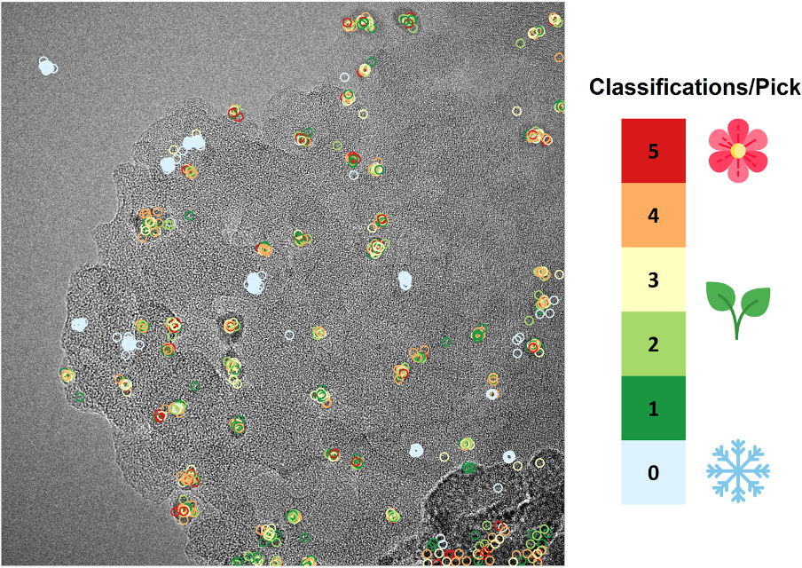 Figure 2: Original, 2048 x 2048 pixel raw electron microscopy image with reconstructed picks. The colour code on the right indicates the number of classifications for each individual pick (shown as coloured circle).