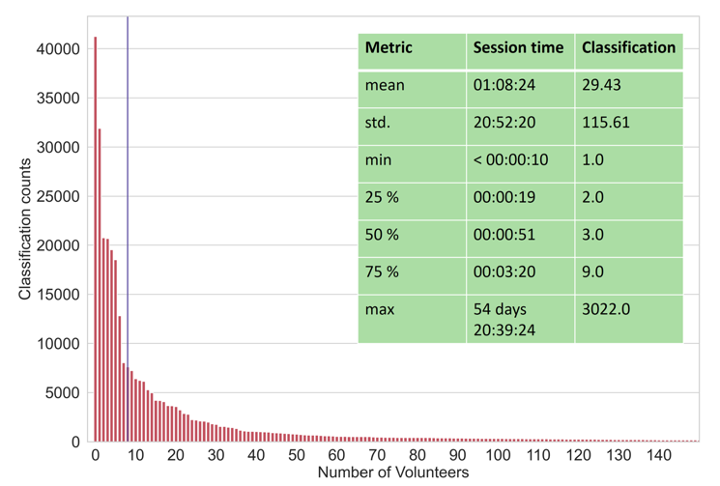 In addition, we can consider the number of classifications done per individual user and in all honesty, we have been completely staggered: We have individual citizen scientists who contributed over 20,000 classifications for this workflow!