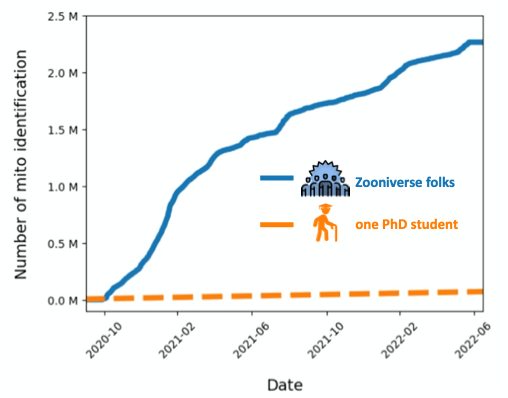 First and foremost, we would like to thank all of you for your amazing work so far. In the Mito Mapper workflow, you have created a whopping 2,234,356 identifications! The plot below shows how we got here. If a PhD student identifies 100 mitochondria in a day, it would have taken them 54 years to reach the same number.