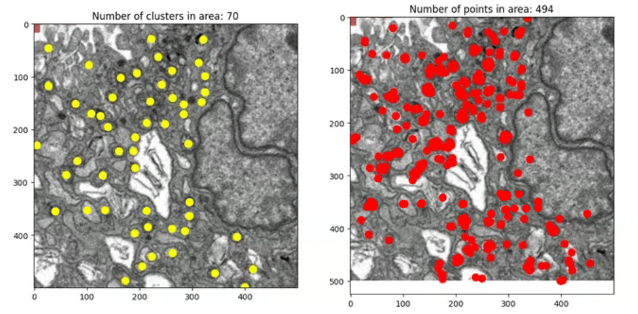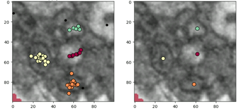 Here’s how the algorithm works on a larger region. The image on the right shows where the picks from Mito Mapper are, and on the left shows the centre of clusters after performing DBSCAN, the number of which has reduced seven-fold compared to the former: