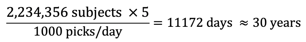 That sounds like a plan, right? However, we simply could not have predicted that over 2 million classifications would be made in Mito Mapper. We are getting a lot of help for the Mito Mop Up workflow right now, averaging 1000 picks in a day. But then we did the maths and found that it would take 30 years for all the subjects to be checked by 5 volunteers! That’s taking a little too much of everybody’s time.