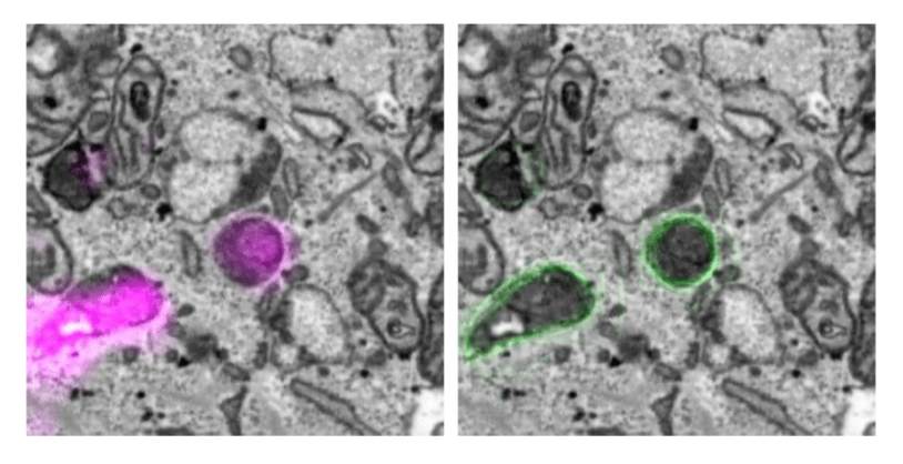 The two images we share show the lysosomes labelled with fluorescent pink dye on the left, and the collective segmentations of the Zooniverse volunteers in green on the right. As you can see, you’ve done a brilliant job outlining these lysosomes. This is just one image from a huge stack, so our next step will be looking at all the data together.
