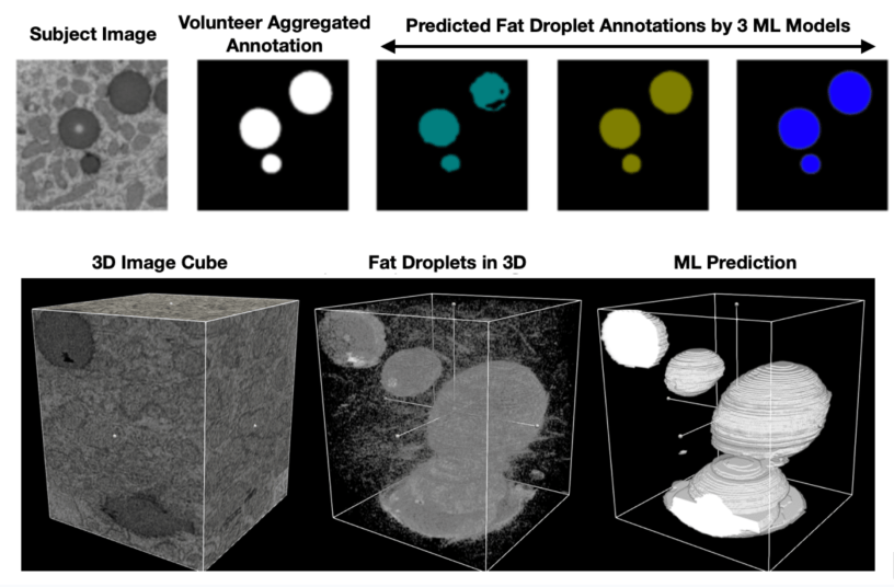 Since the successful completion of these projects, we have been working hard to analyze the data contributed by Zooniverse volunteers. Your efforts have enabled us to train various machine learning models for fat droplet identification. In the images shown above you can see the results of one of these machine learning models – in the top row we show a single 2D image from our original data set alongside the collective volunteer annotation of the lipid droplet, we then show three images from different machine learning models predicting the location of the lipid droplets (in green, yellow and blue). You can read more about this work here.