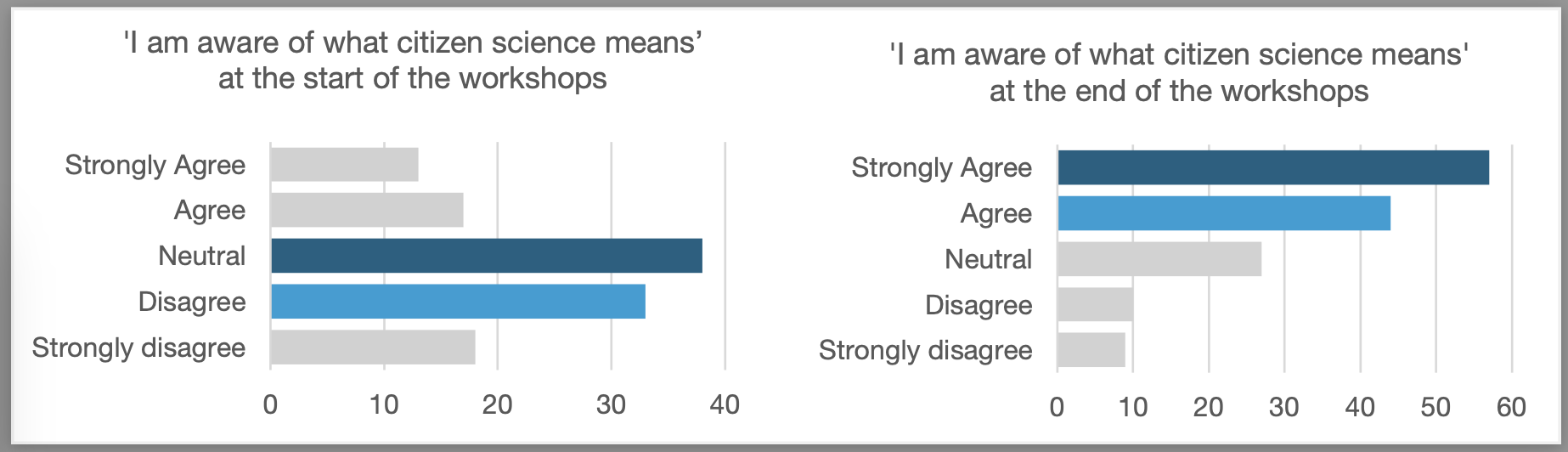 We compared survey responses from students at the start and the end of the core workshop series. At the start of the workshops, the majority of students answered with “neutral” or “disagree” when given the statement “I am aware of what citizen science means”. However, the majority answered with “agree” or “strongly agree” to the same statement at the end of the workshop series.