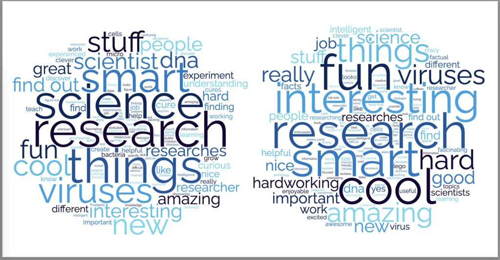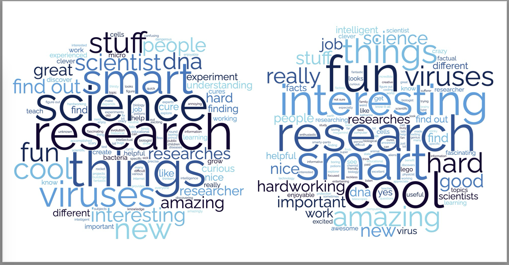 Initially, when asked how they would describe a research scientist, the most common answer was a variant of “they research science” or “they research things”. Words were less personal, more objective (the top 5 by frequency: research, science, things, smart, viruses). After the workshops and the Q&A with researchers, the language was more subjective and emotive (cool, fun, research, smart, interesting). See below for the full word clouds:
