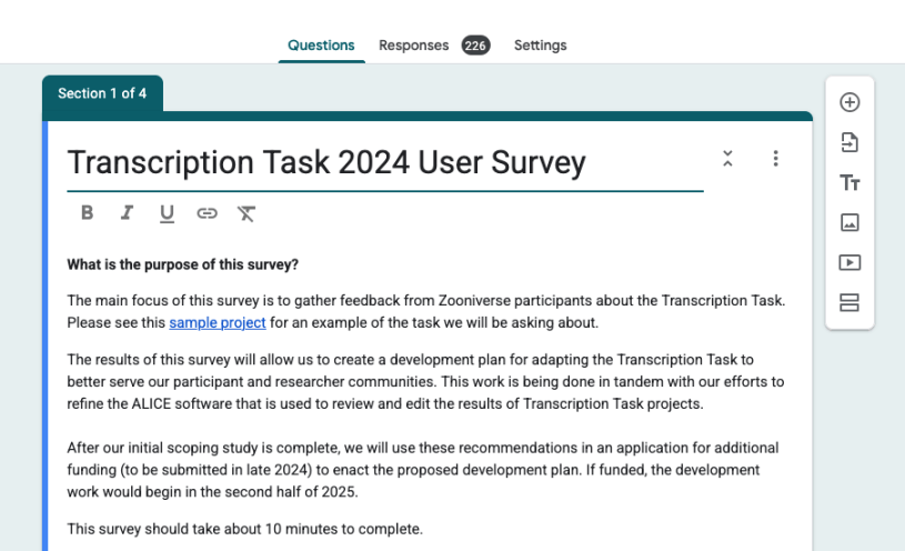 In January 2024, we received a Level I Digital Humanities Advancement Grant from the National Endowment for the Humanities, to allow Zooniverse team members to carry out an evaluative study of the underlying code, functionality, and user interface of our main tools for text transcription and analysis. This effort also supported the creation and dissemination of two surveys about these tools, one for research team members, and one for project participants. The idea was that, through these surveys and code review, we would identify a set of recommendations for upgrades and new feature development to help ensure the viability and usefulness of these tools in the future.